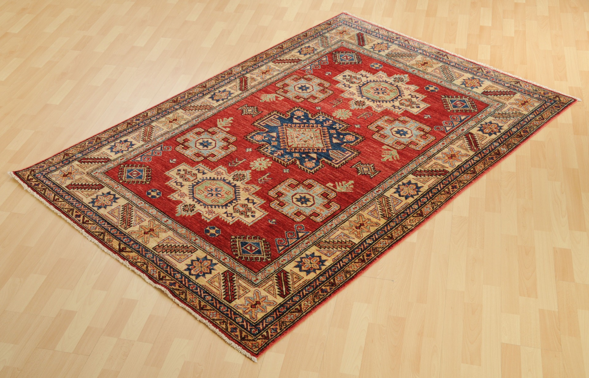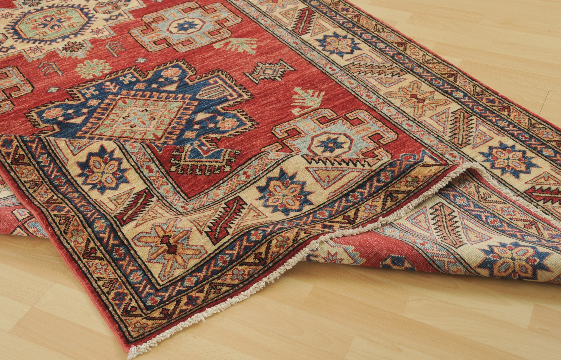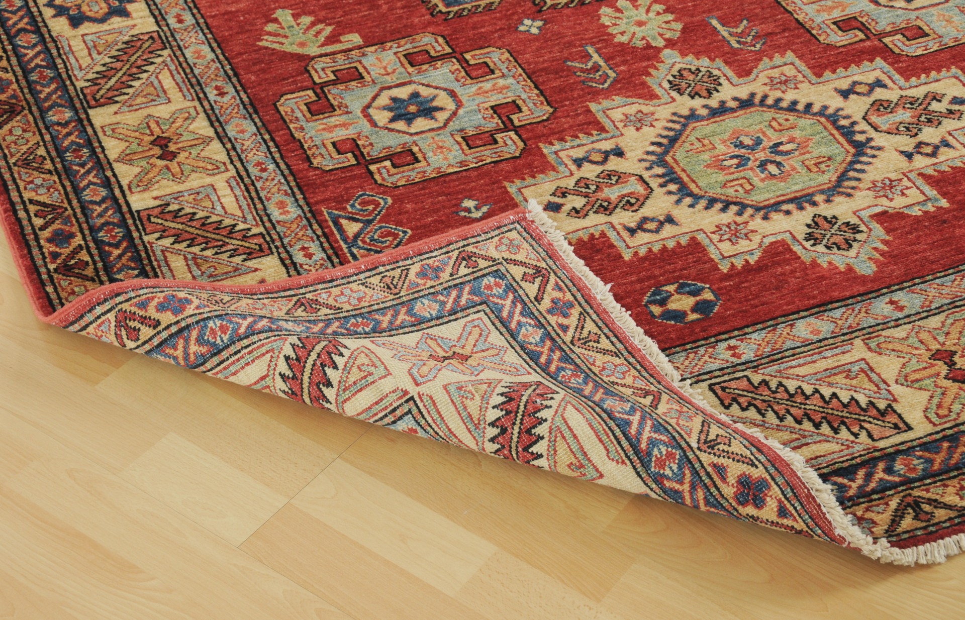 KAZAK es, en origen, un nombre tribal, ahora una ciudad, un río y un distrito en el extremo en el oeste de Azerbaiján, los Caucasos. En las alfombras de KAZAK se observan una amplia gama de tamaños con lanas brillantes y diseños vigorosos. Los tejedores eran los nómadas de Tirkic, que vinieron a la región en el momento de la gran migración. Estas alfombras se anudan a mano en PAKISTÁN. Su decoración se inspira en motivos geométricos rusos y la lana se tinta con texturas vegetales naturales. Son muy resistentes y de vivos colores. Se lavan a la piedra para otorgarles ese especial toque satinado que las caracteriza.